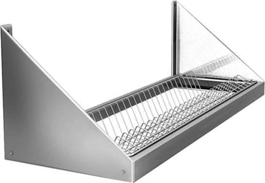 Материал изготовления - нержавеющая сталь AISI 430, решетка выполнена из никелированной стали. Стальная полка для посуды не окисляется и не испаряет опасные химические вещества, что соответствует требованиям СанПиН. Полка навесного типа позволяет рационально использовать производственные площади. Крепить сушилку необходимо к влагоустойчивой поверхности.
