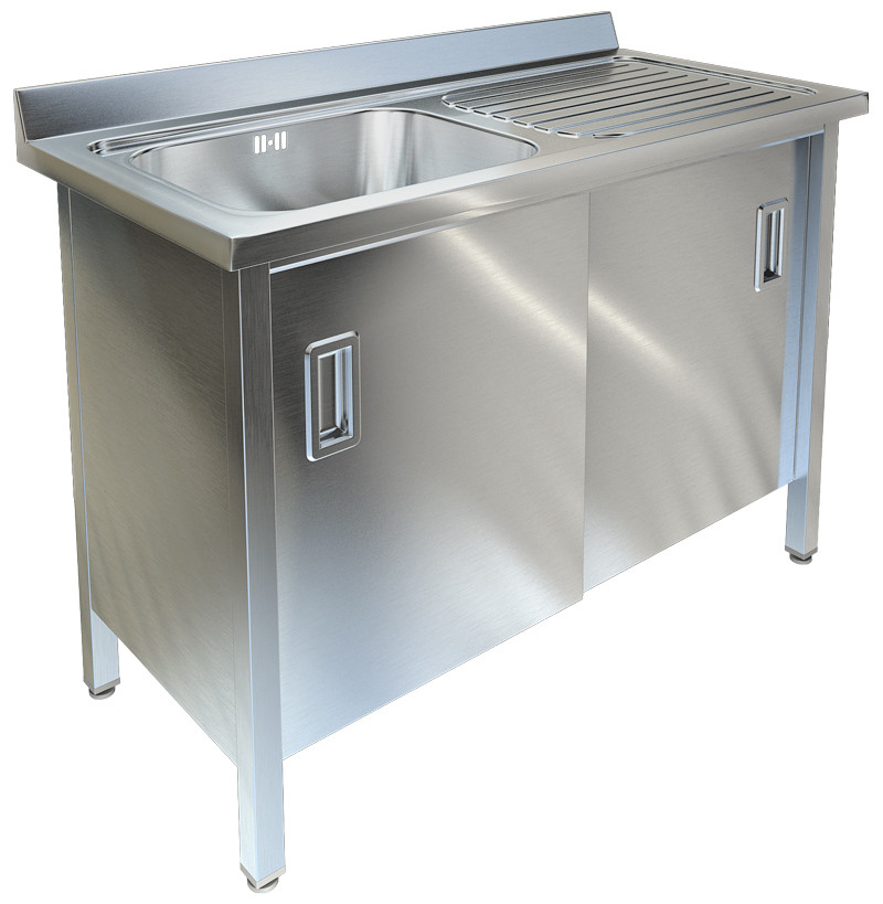Столешница служит рабочей поверхностью для обработки продуктов и расстановки посуды. Шкаф с распашными дверцами используется для хранения кухонной утвари. Ножки ванны с регуляторами по высоте позволяют устранить неровности пола, исключить раскачивание и наклон мойки.
