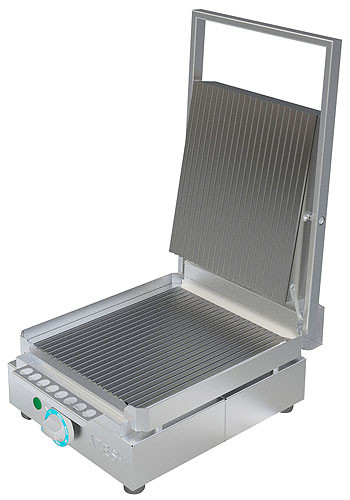Пресс-гриль (гриль контактный) «Маэстро» ГК-1/1.55Р предназначен для быстрого приготовления рыбы, мяса, овощей, горячих бутербродов, сосисок, шаурмы, сэндвичей и тостов. Состоит из двух нагревающихся поверхностей, открывающихся по принципу книжки. На нижнюю часть кладутся продукты, которые прижимаются верхней частью. Контролируя силу нажима, повар может ускорить процесс приготовления блюда. А благодаря рифленой жарочной поверхности, на готовых блюдах получается аппетитная и хрустящая корочка.